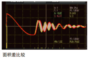面積比較可用來檢測鉛酸電池芯的正負極板之間是否絕緣不良或隔離膜不存在。面積比較是將測試的波形總面積與樣品的波形總面積做差異比較,總面積的差異表現(xiàn)出了電池芯絕緣程度的好壞。當(dāng)電池芯正負極板之間的絕緣不良或是隔離膜不存在時,在足夠的電場強度/電壓下會造成放電,瞬間的能量釋放導(dǎo)致波形瞬間快速衰減, 所以測試的波形總面積會比樣品的波形總面積小。