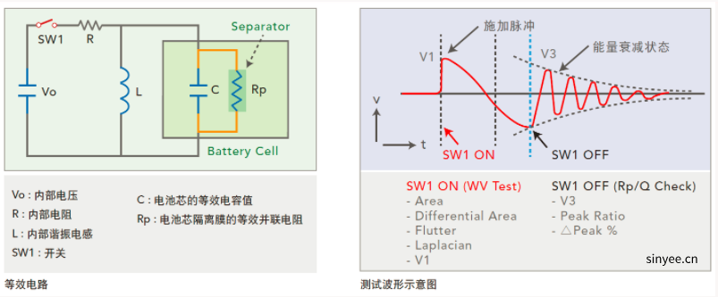 諧振波形中的第三個電壓峰值。當(dāng)電池芯正負極板之間的絕緣不良或是隔離膜不存在時,在足夠的電場強度/電壓下會造成放電,能量的釋放會導(dǎo)致第三個電壓峰值的電壓比良品低。當(dāng)電池芯的絕緣品質(zhì)較差時,因為能量損失的較快也較多,也會導(dǎo)致第三個電壓峰值的電壓比良品低。