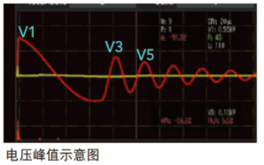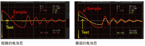 諧振波形中的第一個電壓峰值。當(dāng)電池芯正負極板之間的絕緣不良或是隔離膜不存在時,在足夠的電場強度/電壓下會造成放電,會導(dǎo)致第一個電壓峰值比樣品的第一個電壓峰值低。