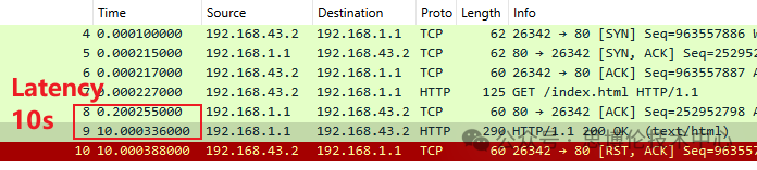 如果我們不使用Think參數來保持連接,而是在服務器側通過服務器延遲響應的方式來控制連接的時長,Avalanche模擬的服務器會在收到HTTP請求后等待Lantency的時間計時完成再回復響應數據,由于此時HTTP的會話也處于保持階段,因此采用這種方式來控制連接時長的方法我們稱之為七層并發(fā)。