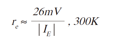 其中上下電壓由下標u和l表示。它們的區別在于輸入和輸出差分電壓。放大器的上側和下側都會影響總增益,所以在Av的BJT增益前面x2。因為RE(R4254)非常接近BJT的動態發射極電阻re,所以更好的增益近似是在增益方程的分母中將RE增加2 x re,其中: