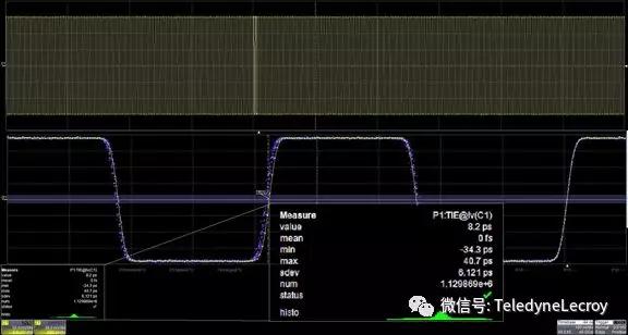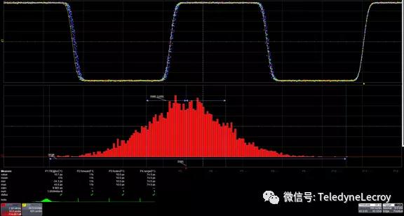 對于示波器測量參數(shù),也可以使用統(tǒng)計功能,統(tǒng)計功能可應(yīng)用于示波器中可用的任何測量參數(shù),圖4是時鐘信號的時間間隔誤差(TIE)測量的示例。